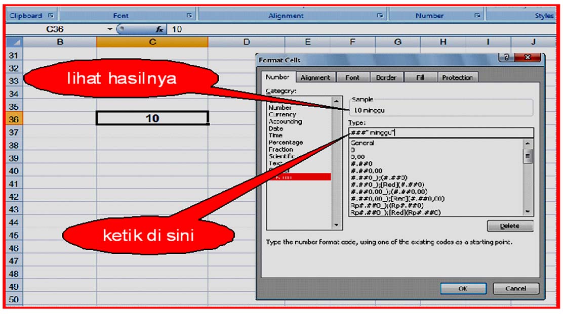 Misal suatu sel akan diisi "banyaknya minggu", maksudnya agar jika sel tersebut ditulis angka keluar "berapa minggu", caranya :