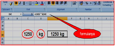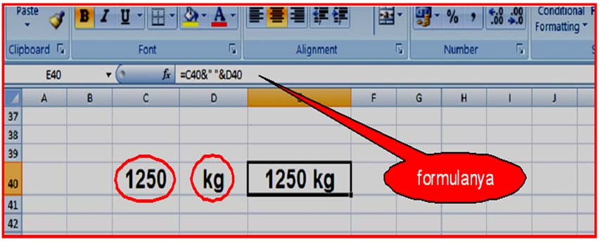 Misal : pada sel C40 berisi 1250 dan pada sel D40 berisi kg kemudian akan dibuat kalimat gabungan sehingga berbunyi ”1250 kg” pada sel E40 , maka caranya : pada sel E40 diketik formula : ”=C40&" "&D38”
