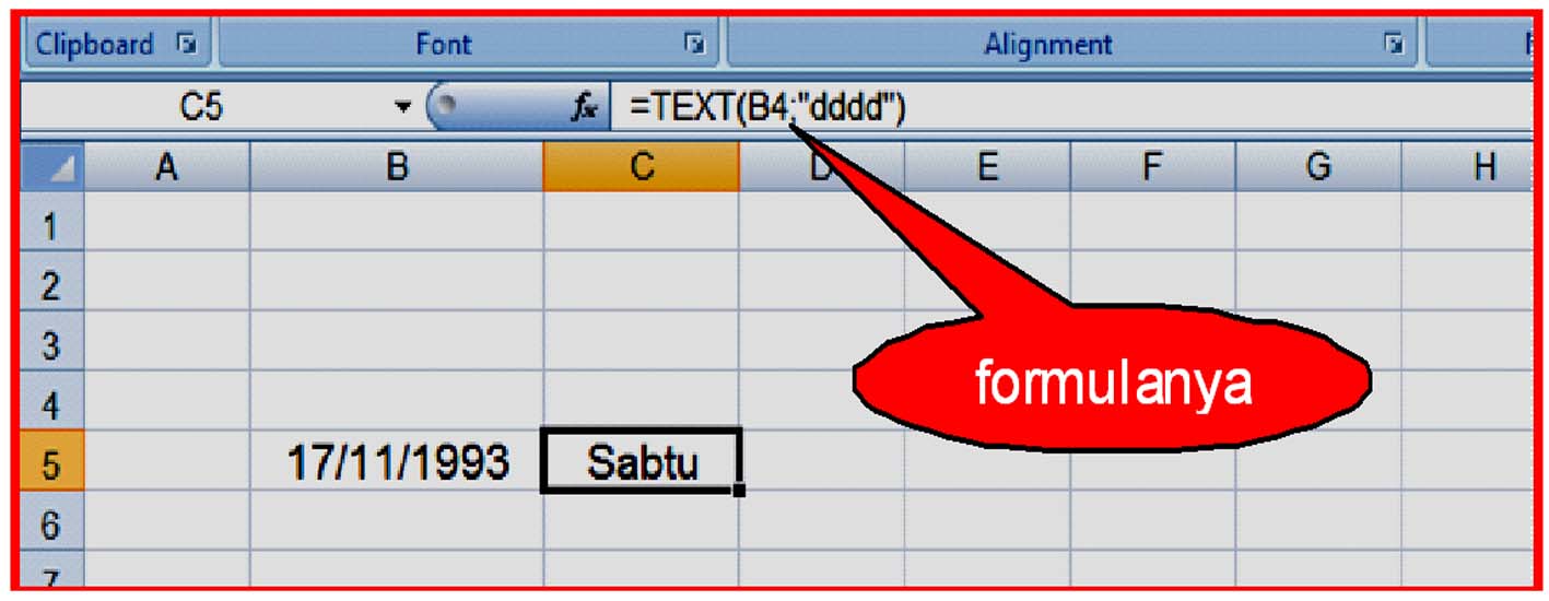 Misal akan dicari harinya apa pada tanggal 17 November 1993, formulanya : ”=TEXT(nama sel berisi tanggal;"dddd")” --> tanggal ditulis misalnya : 17/11/1993.