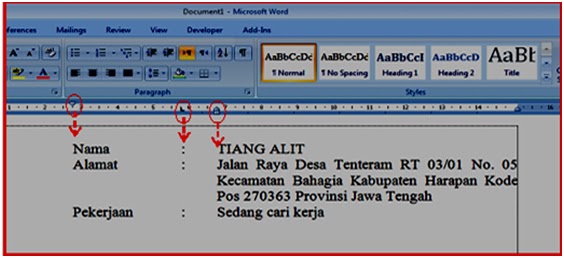 - Kalau sudah ditentukan tabulasinya, maka sebelum kata/kalimat yang akan diletakkan setelah tabullasi tekan tombol Tab