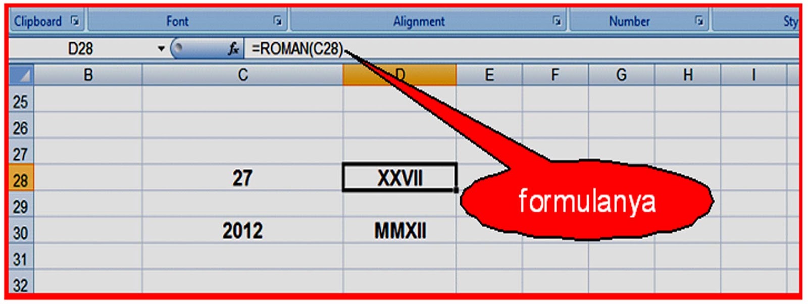 Caranya misal pada sel C28 tertulis angka biasa dan pada sel D28 akan di tulis angka Romawinya, maka pada sel D28 diketik formula ”=ROMAN(C28)”, seperti ini :