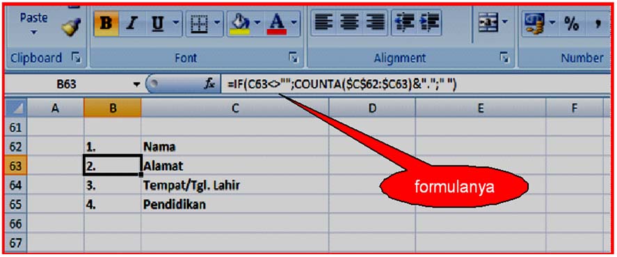 Formulanya : Misalnya pada kolom sel C baris 62 dan seterusnya (C62, C63, C64, dan seterusnya) akan diisi data. Agar pada sel kolom B di sebelahnya terisi nomor secara otomatis, maka pada sel kolom B baris 62 dst. tersebut diketik formula :