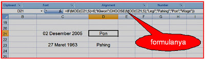 - ketik formulanya misal pada sel D21 seperti ini : =IF(MOD(C21;5)=0;"Kliwon";CHOOSE(MOD(C21;5);"Legi";"Pahing";"Pon";"Wage")), Enter; seperti gambar berikut ini :
