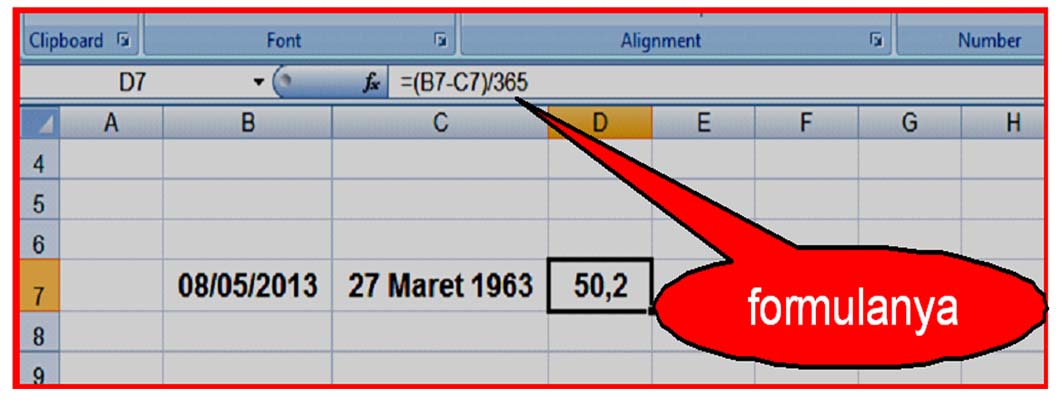 - ketik formulanya misal pada sel D7 seperti ini : ”= (B7-C7)/365”, Enter; seperti gambar berikut ini --> (1 th. = 365 hari)