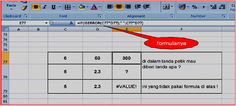 Untuk tidak menampakkan hal itu Caranya : Misal suatu sel berisi formula : "=6*5(6x5)", agar kalau selnya kosong tidak keluar pesan, maka ketik formulanya : "=IF(ISERROR(C77*D77);" ";C77*B77)"